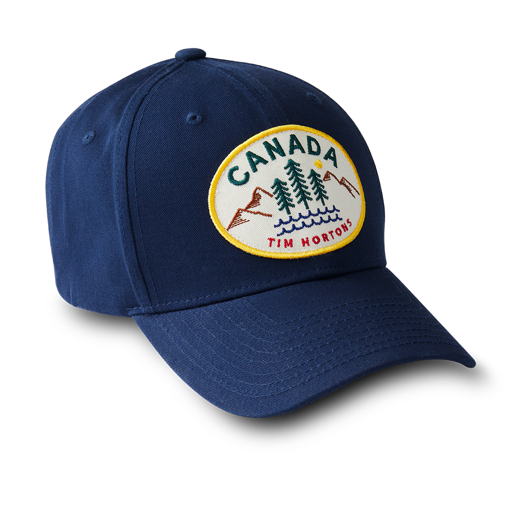 Hats off to the Tim Hortons Canada travel collection. Show your love for all things Tims with this Canada patch. navy baseball cap.